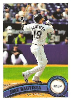 #3 – Jose Bautista (#216): For me, this is the enduring image of 2010. Jose Bautista, the Brady Anderson of the 21st century, hitting one of his 54 home runs from last season. Or is it? The more I look at this card, the wonder I don't wonder if this was just a long foul ball. The angle that his body is turned at (extremely closed off), his line of sight (down the left-field line from my estimation) and the general lack of urgency (kinda of hard to tell from a still photograph, but check out the body language) makes me think not is all it seems.